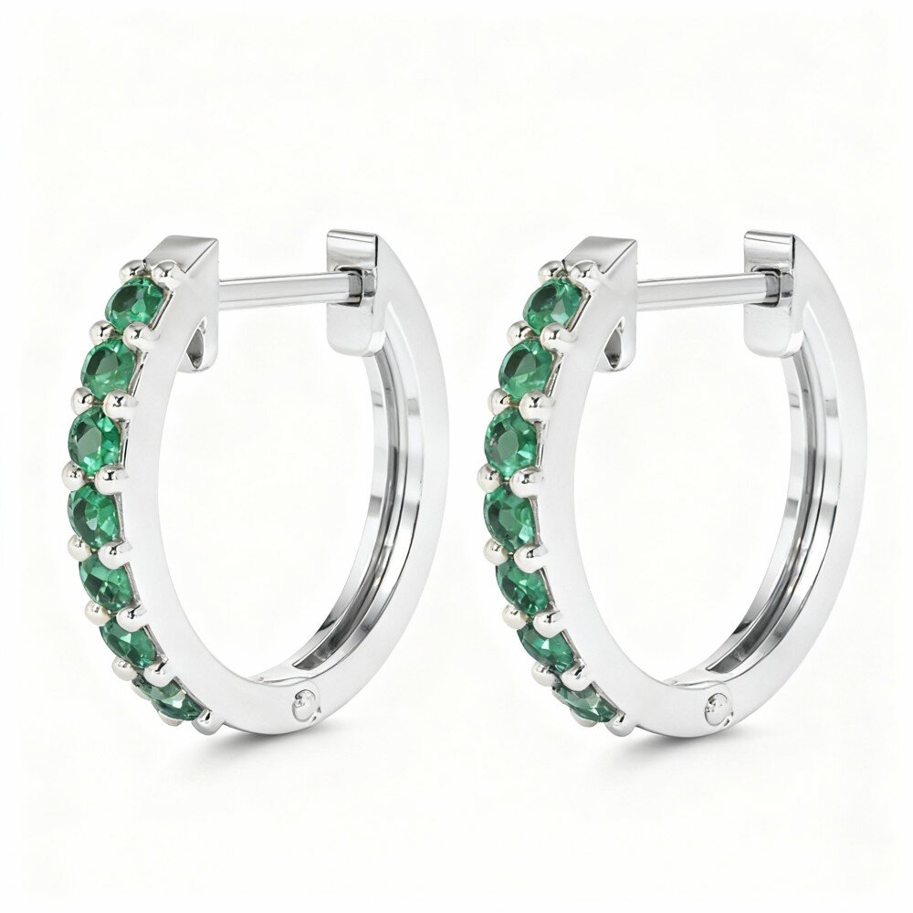 Os brincos têm diâmetro interno de 10 mm e diâmetro externo de 12 mm, proporcionando um ajuste elegante e confortável. São adornados com 14 esmeraldas redondas, cada uma medindo 1,5 mm, que realçam lindamente o design geral.