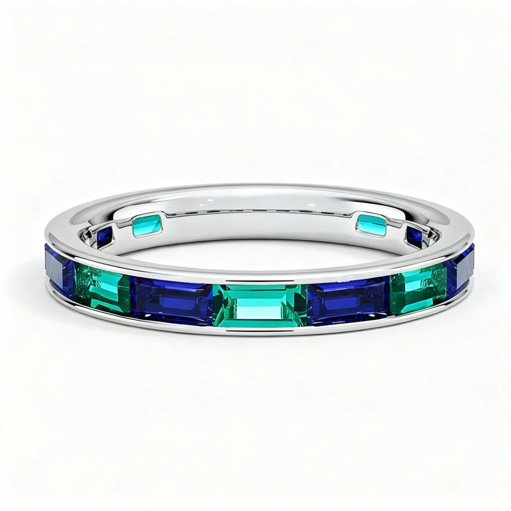 Feita de Ouro Branco 9K de alta qualidade, esta aliança de casamento foi projetada para ser elegante e significativa. A combinação impressionante de água-marinha e esmeralda não apenas adiciona um toque vibrante ao seu dia especial, mas também serve como uma tela para gravações personalizadas. Esse recurso permite que os casais gravem sua história de amor, tornando-a uma lembrança preciosa. Ideal para aqueles que valorizam tanto o estilo quanto o sentimento, esta aliança simboliza lindamente a jornada de um casal. O design é perfeito para pessoas que desejam mostrar seu relacionamento único por meio de joias. Além disso, nossa peça de joalheria com configuração em canal inclui sete esmeraldas cultivadas em laboratório cortadas em baguete, complementadas por seis água-marinha também cortadas em baguete, cada uma medindo 4 x 2 mm. As esmeraldas exibem um rico tom verde com clareza notável, enquanto a água-marinha brilha com um azul intenso, criando uma peça harmoniosa e vibrante. Esta joia atemporal não apenas eleva seus momentos especiais, mas também reflete um compromisso com o luxo sustentável, tornando-a uma adição requintada a qualquer coleção.