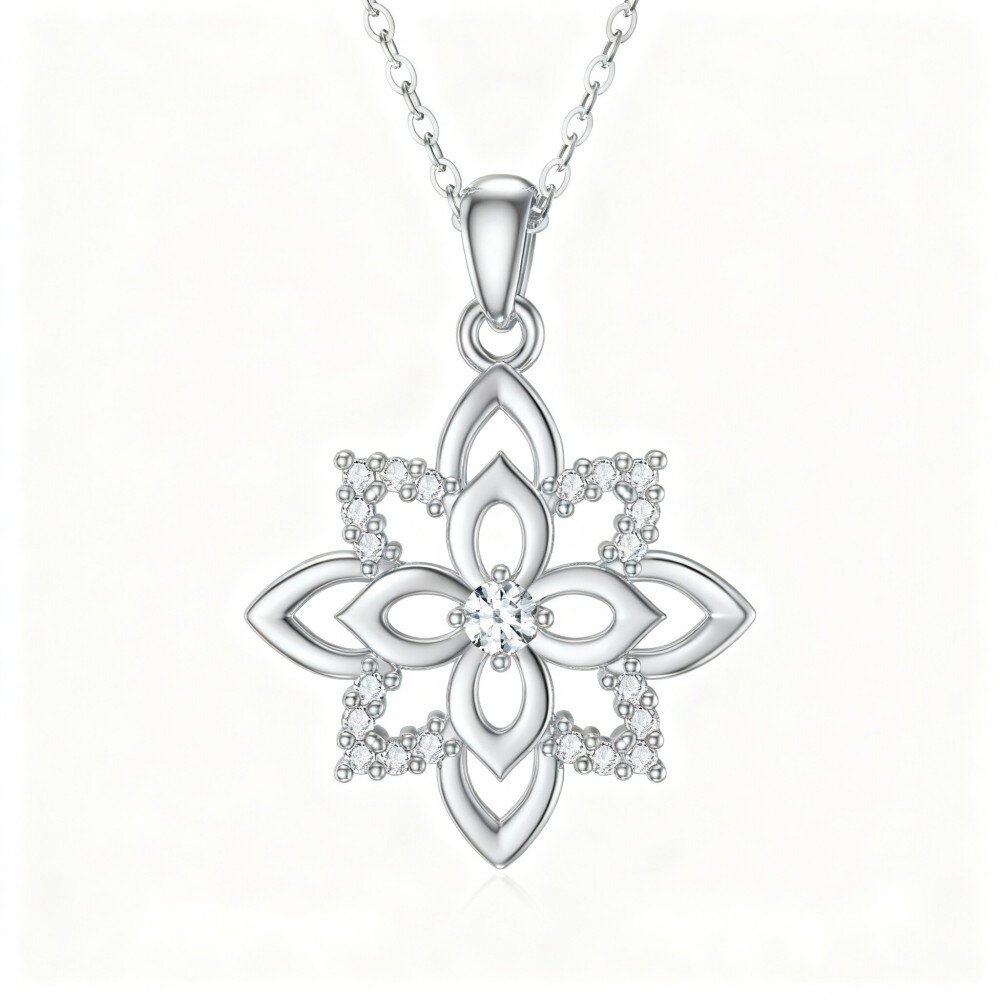 Eleve sua elegância com nosso deslumbrante colar com pingente em Ouro Branco 9K com zircônia cúbica cintilante, artisticamente desenhado no formato de um trevo de quatro folhas e lótus, com curadoria exclusiva para mulheres que apreciam beleza e sofisticação atemporais.