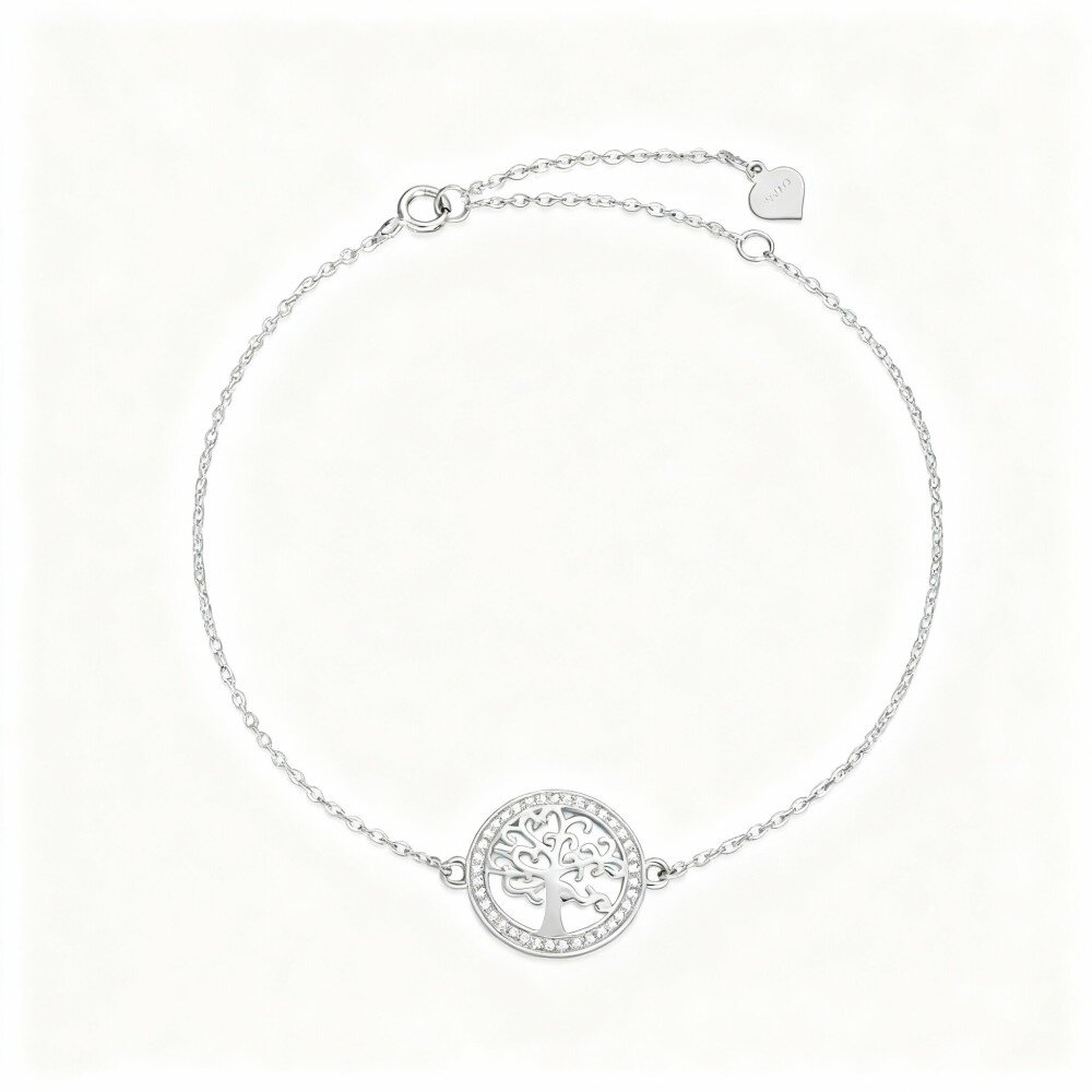 Descubra a nossa deslumbrante Pulseira Pendente Árvore da Vida em Ouro Branco de 9K, com deslumbrantes acentos de zircónias cúbicas, concebida exclusivamente para mulheres que apreciam uma elegância intemporal e um significado simbólico na sua coleção de jóias.