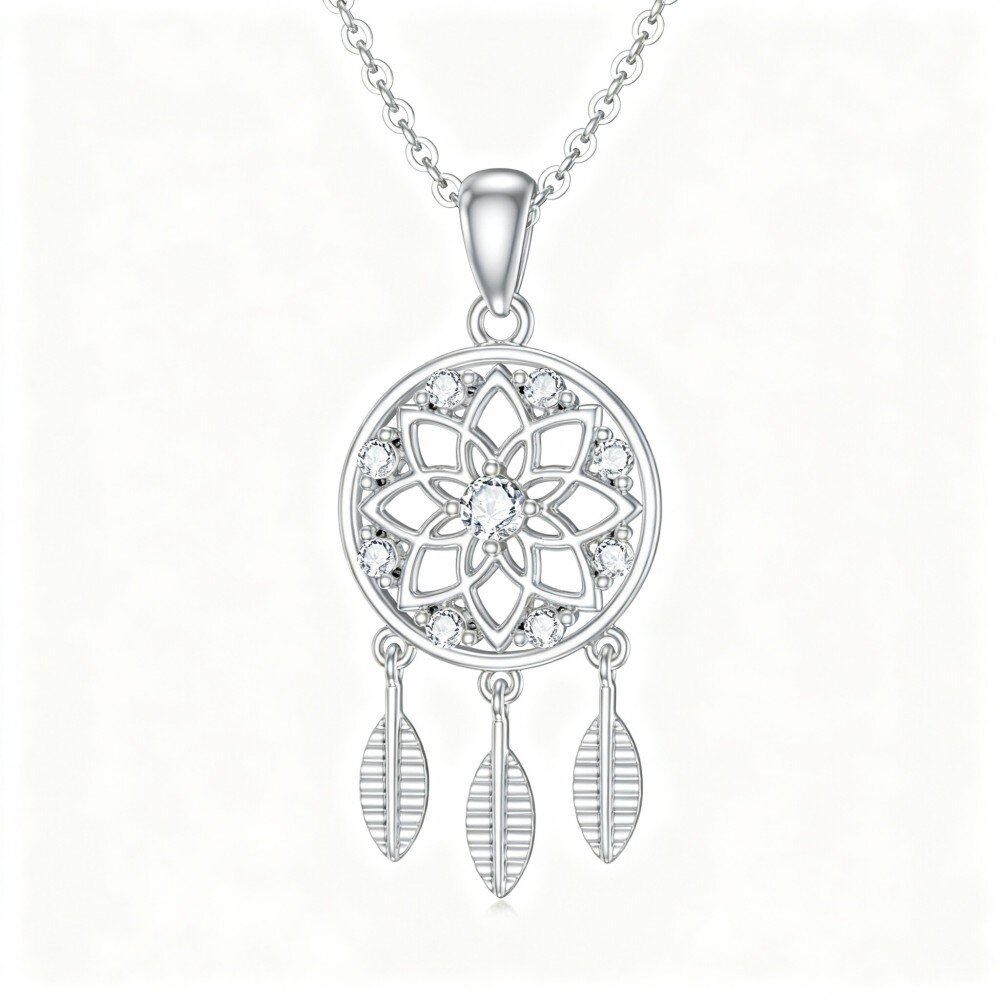 Descubra o nosso deslumbrante colar com pendente em Ouro Branco de 9K, com um design circular de apanhador de sonhos adornado com deslumbrantes zircónias cúbicas - o acessório perfeito para mulheres que apreciam a elegância e a mística na sua coleção de jóias.